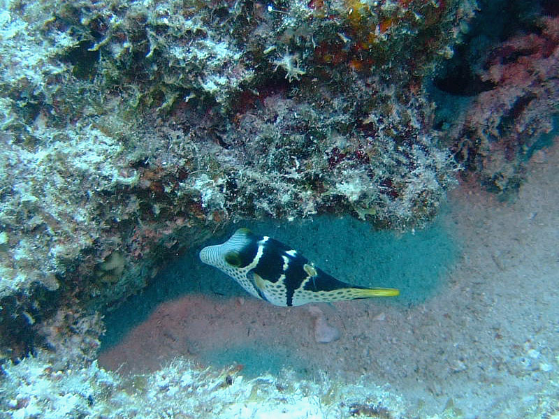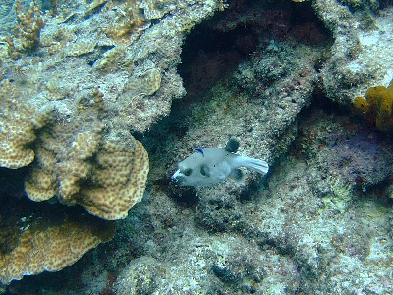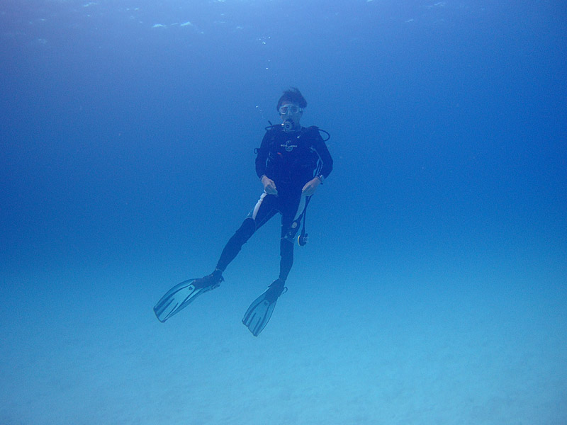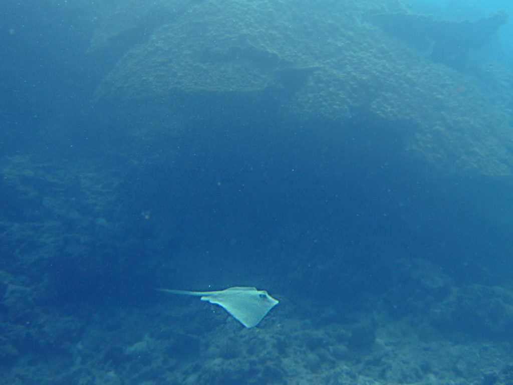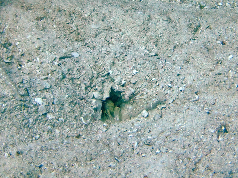 アカエイを見たのはこれが初めてです。悠々と泳いで通り過ぎて行きました。あとはハゼとエビの共生。決してめずらしいわけではないですが、警戒心が強いので写真に取るのはなかなか難しいです。本気で良い写真を撮ろうと思ったら、そこでずーっと粘っていないと無理なのではないのかなと。(右下のダイバーは自分です)