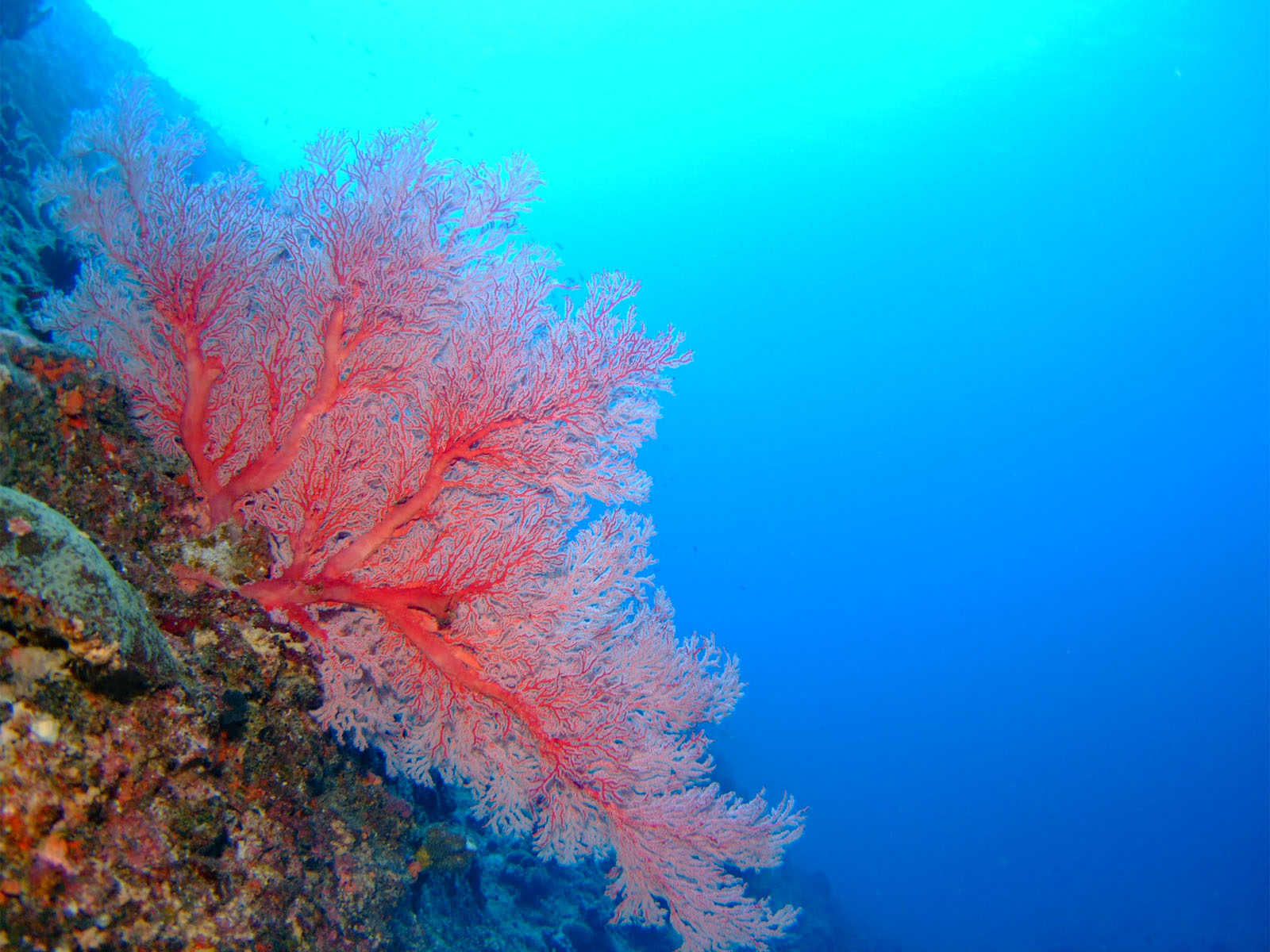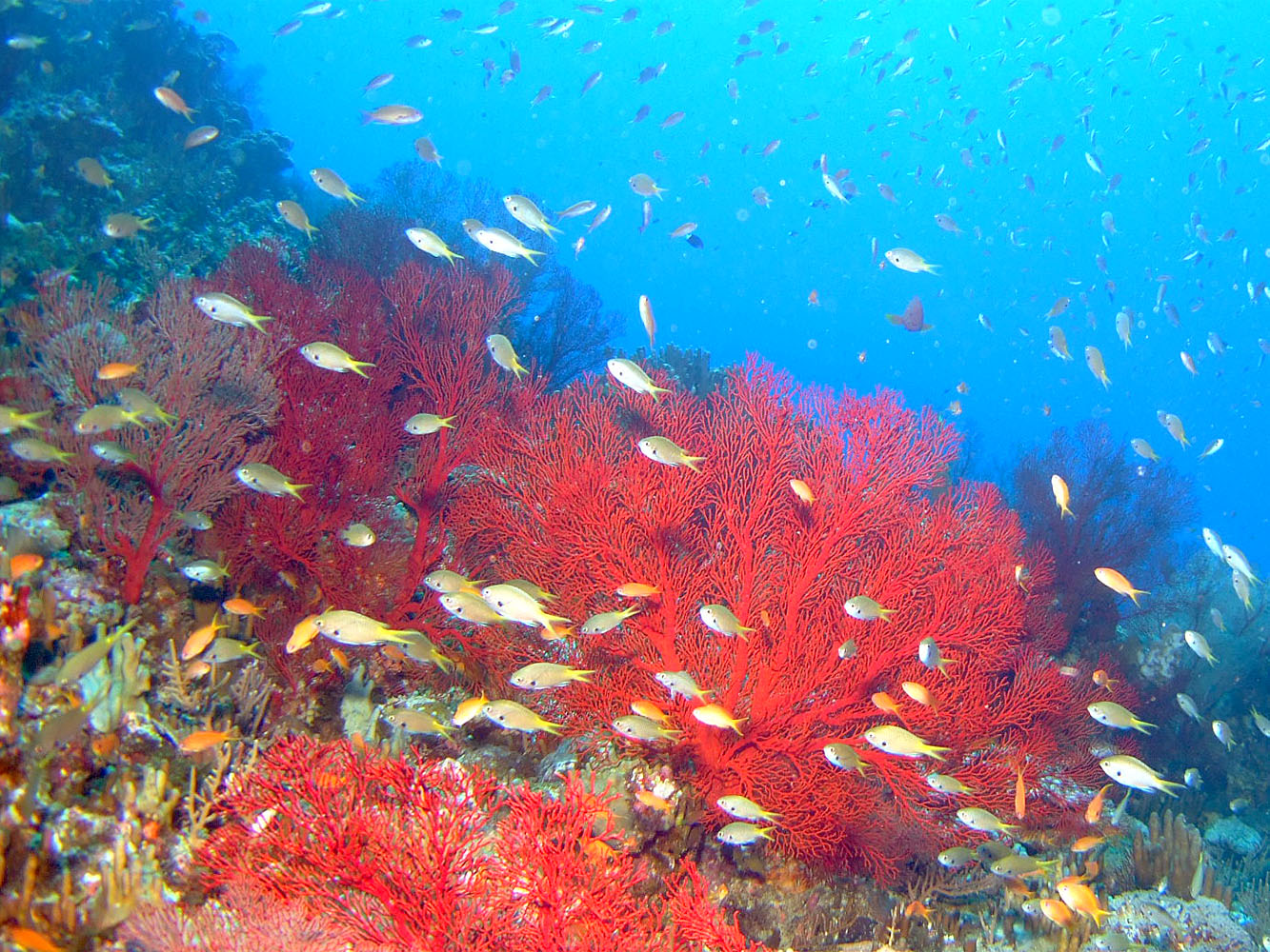 サンゴがブツブツ生えているからブツブツサンゴなのかな? サンゴの上で泳ぐハナダイとかスズメダイの類がきれい。ただイソバナはどれも白いモヤモヤがついていたんだけれど、いったいこれは何なんだ?