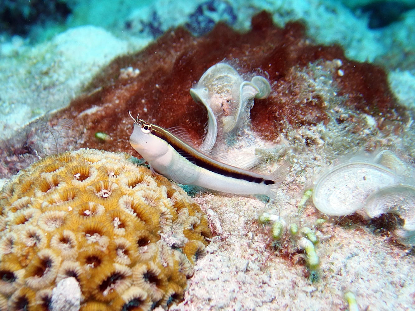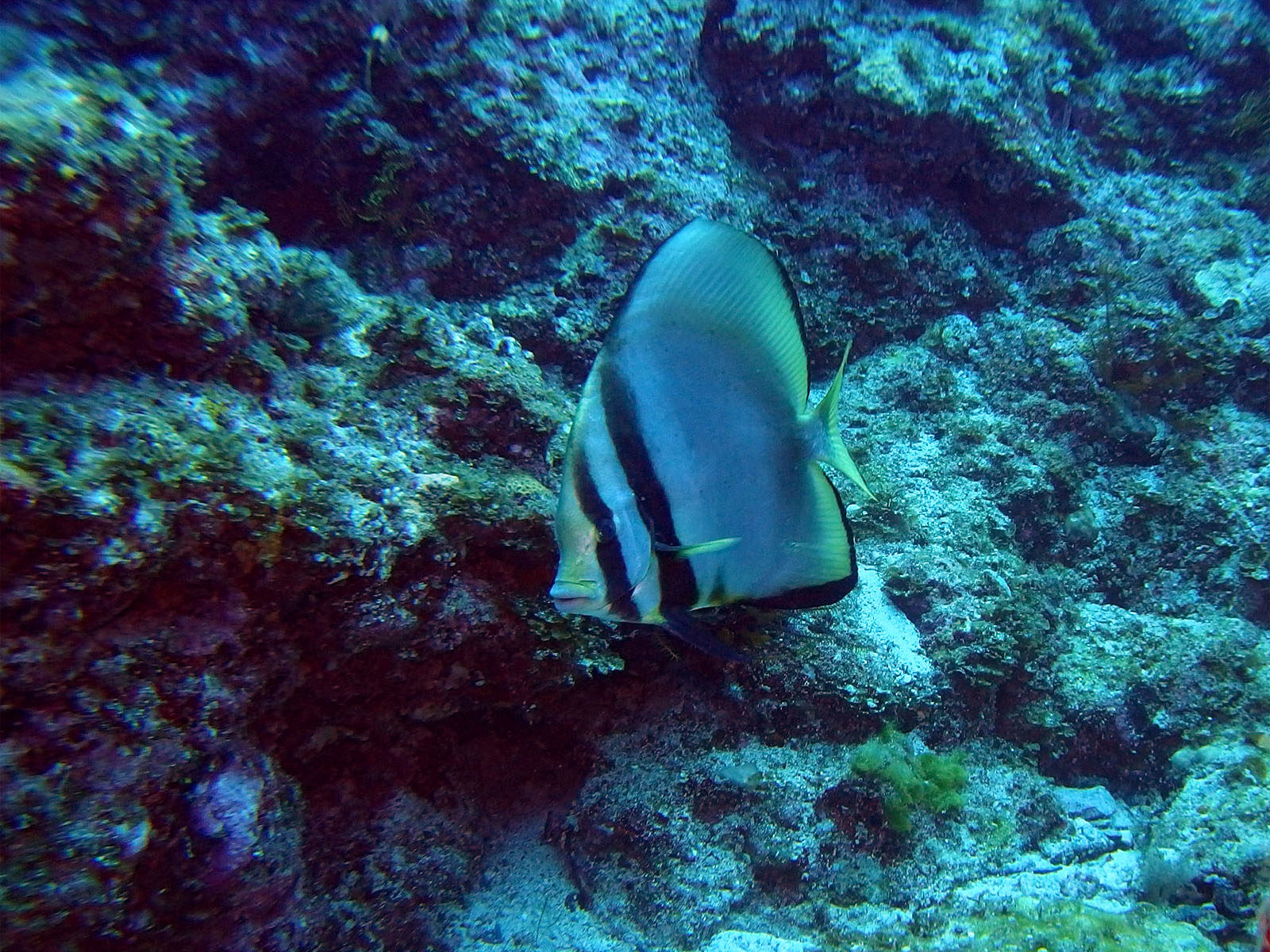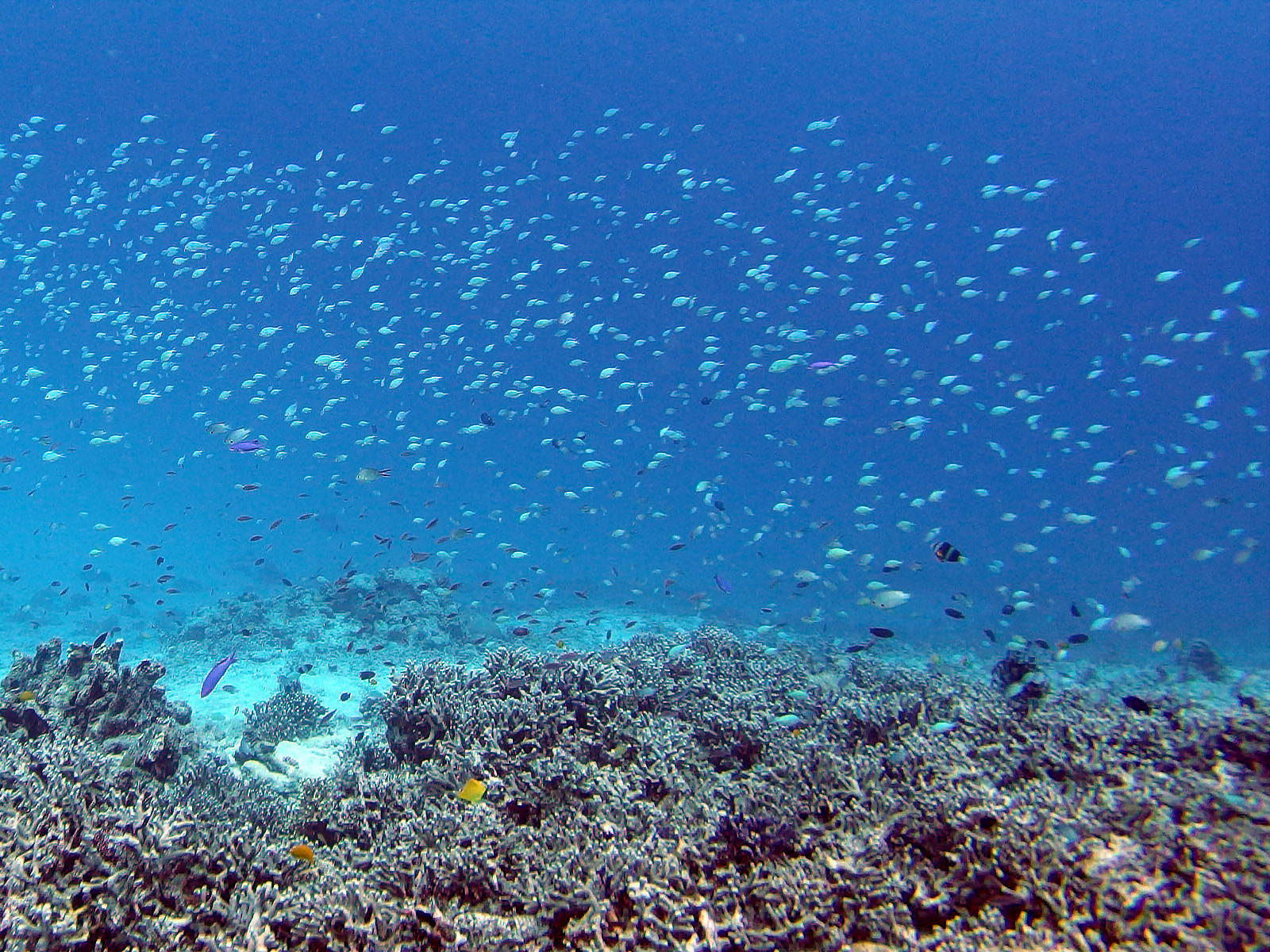 2本目は一気に伊釈迦釈へ。カスミチョウチョウウオの群れ、数もたくさんいて密度も高く、しかもいつもになく近寄れてラッキー。なかなかカスミチョウチョウウオは近寄れないからねー。どの魚の写真も背景がブルーの方がきれいなんだけれど、なかなか思うようには撮れないものです。