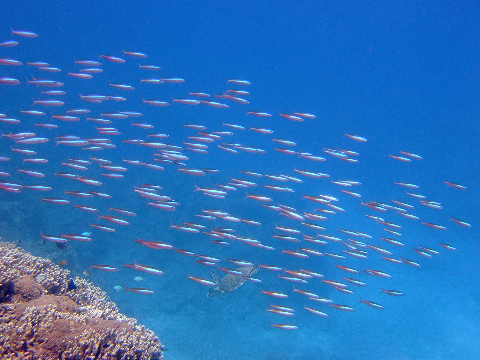 ケラマでウミガメと言えば儀名、儀名と言えばウミガメ。左から二番目の写真にも魚の群れの後ろにウミガメがいますよ。