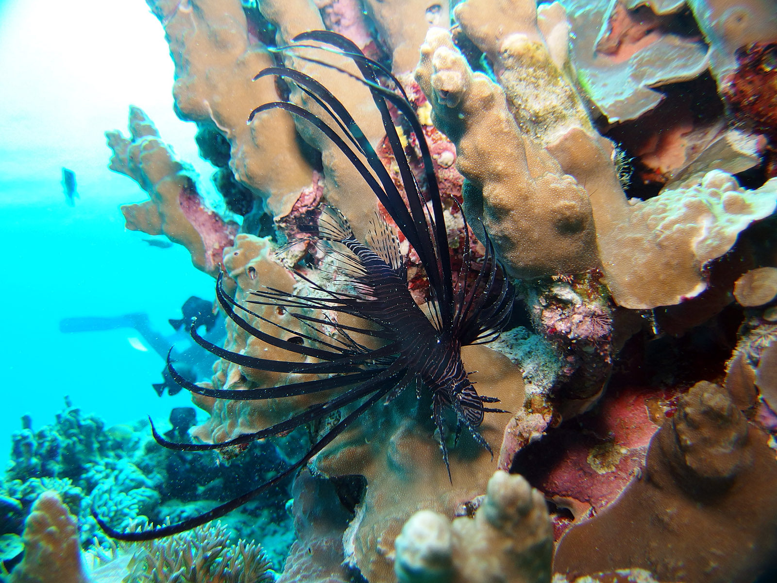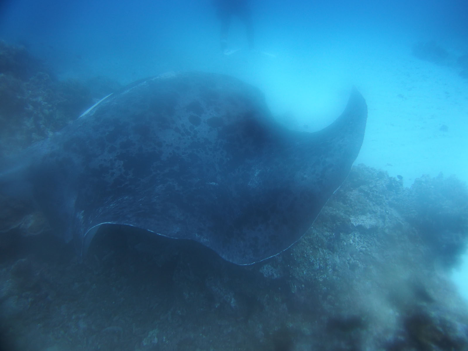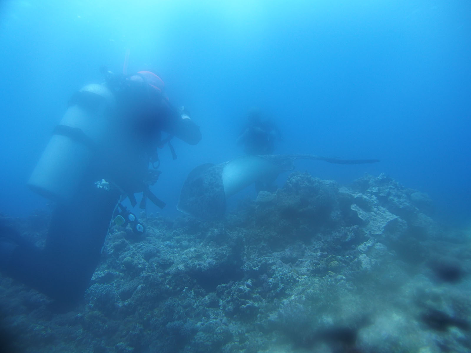 実は実は、、、、今回最後のダイビングになるのに、エントリしたらハウジングがもろに曇っていて(実はもっと大問題につながるのだけれどそれは後ほど)、これは写真は無理と諦めたのですが、そういう時に限って普段ではなかなか見られないものが見えるんですよね。下の左から3枚のの写真、大きなマダラエイです。有に1m以上はあったと思います。ガイドをやっていてもなかなか見られないとのこと。悔しいので写真を撮ったけれどボケボケ、でも証拠写真になるのでアップしておきます。