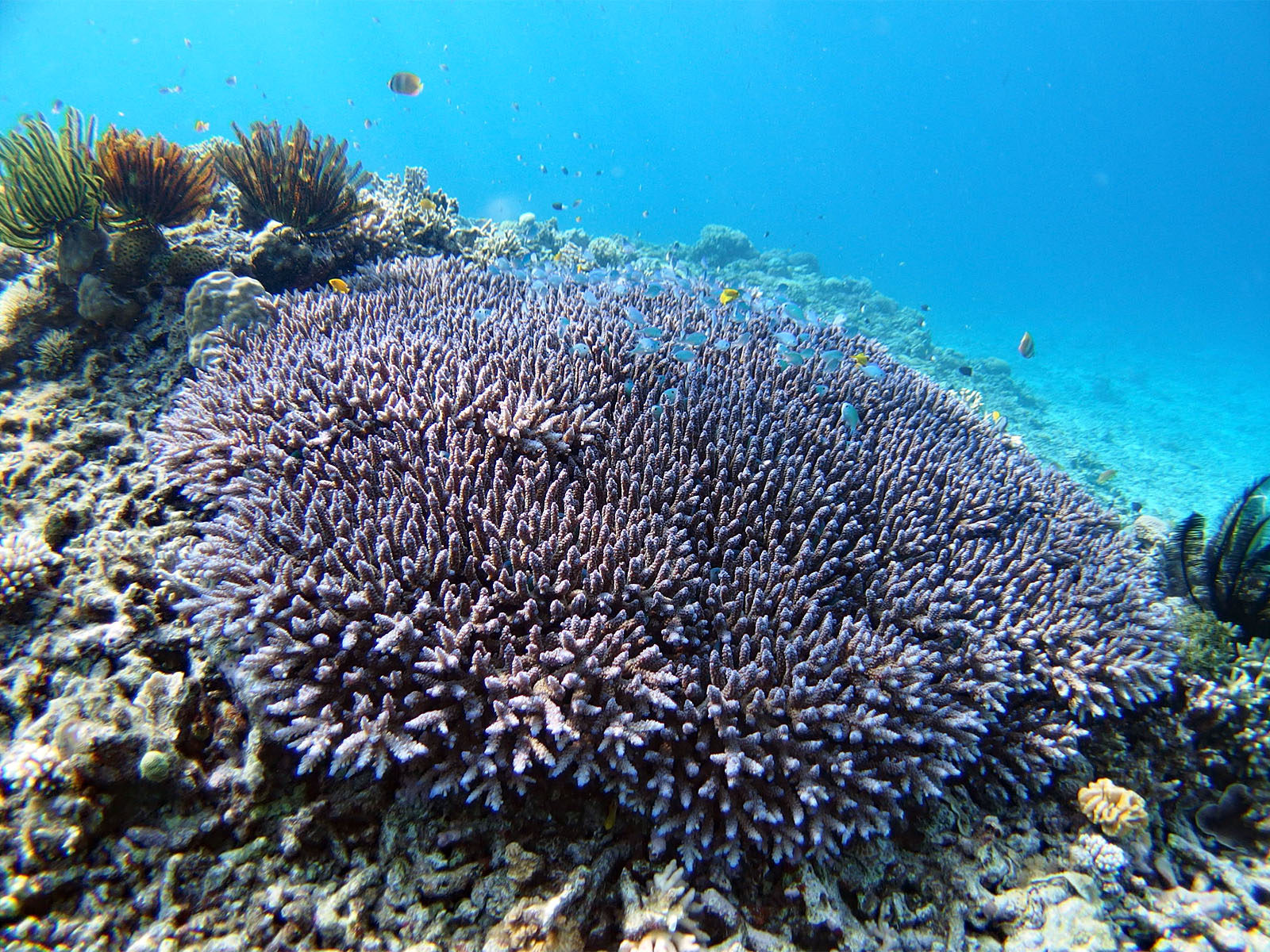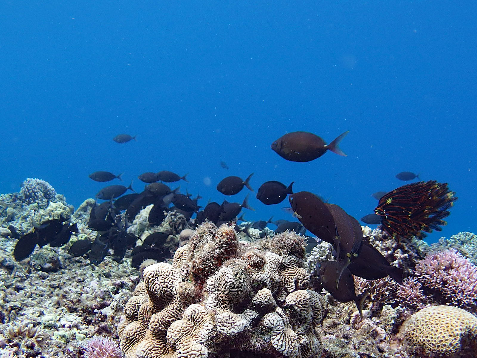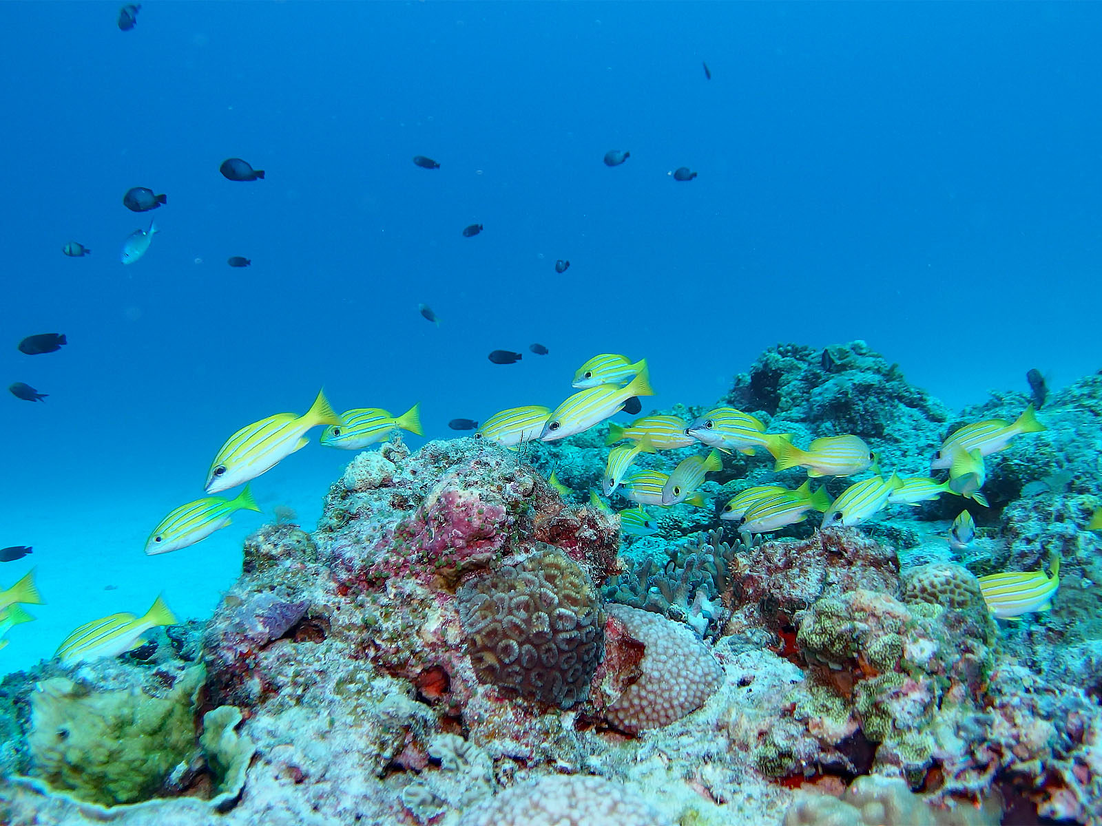今回2回目のウルンノサチですが、ちょっとコースを変えればまた違った風景が。ヨスジフエダイの黄色が真っ青なブルーに映えてきれい。